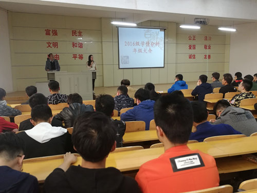 在16届年级会议中,刘老师分析了上一学期16届同学的学习情况,指出部分同学因个人原因造成学期末成绩不达标,以至于挂科及挂科对同学们将来评奖评优及就业的影响,并希望同学们能够端正态度,营造良好学习氛围。