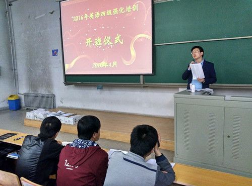 4月26日晚19:30,为了强化学生英语学习意识,找准学习方法,为即将到来的大学英语四级考试做好备考准备,我院在西校区二号楼308教室隆重举行英语四级强化培训开班仪式,邀请外语学院赵剑锋老师,对学院四级未通过学生进行持续近两个月的全程免费强化训练,旨在提高学生的应试能力,顺利通过即将到来的四级考试。外语学院赵剑锋老师、我院李卫红老师以及我院未通过四级学生们参加了此次开班仪式。开班仪式由李卫红老师主持。