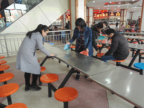 其后,我院又在南村食堂举办了学雷锋实践活动。正逢午饭高峰期,来餐厅就餐的人络绎不绝。在劳动过程中,同学们分组进行、相互配合,认认真真地擦洗并摆放桌椅、收拾残羹、打扫地面的角角落落,给大家创造了良好的就餐环境。休息期间,同学们还和食堂工作人员进行亲切交谈,互相分享劳动的乐趣和日常工作的所见所闻,并听取了他们关于劳动与奉献的见解。他们的话,让参加活动的同学们感受到,当代大学生应该锤炼艰苦奋斗的精神。